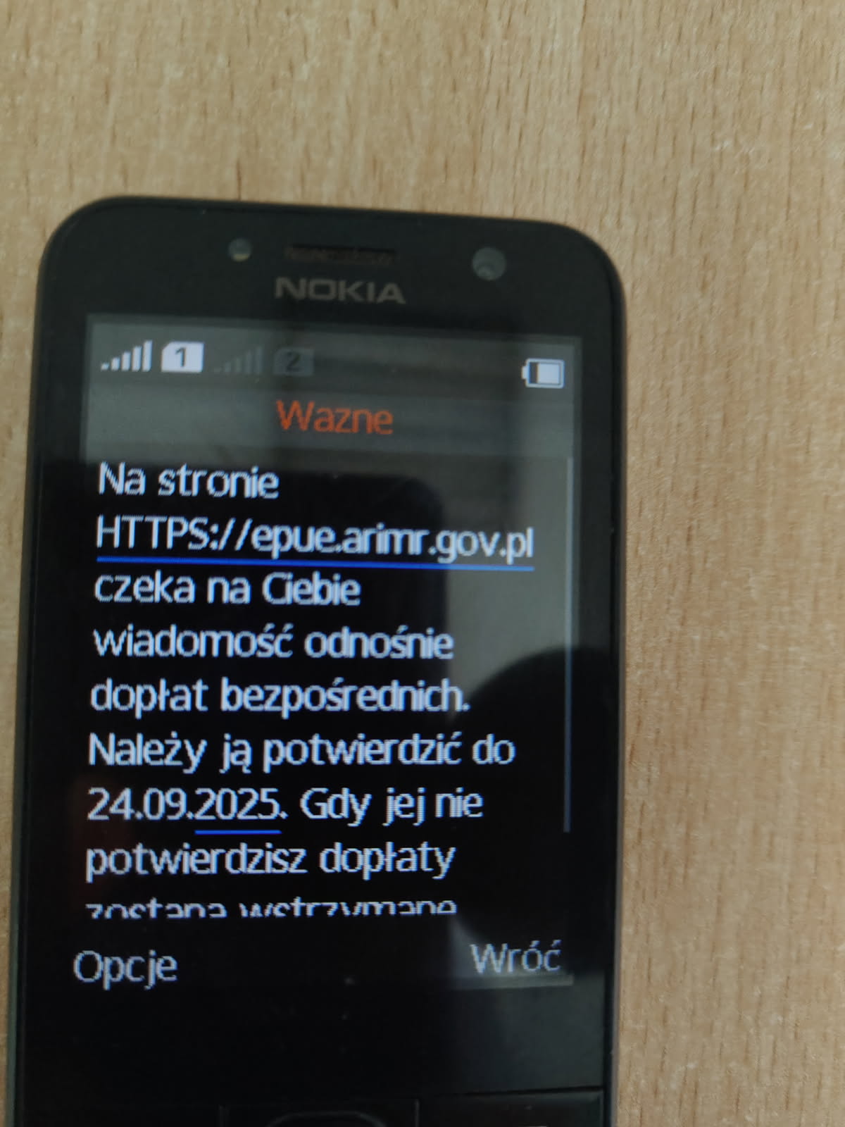 W ostatnim czasie obserwujemy wzmożoną aktywność kampanii phishingowych rozsyłanych SMS-ami do beneficjentów ARiMR. Wiadomości te pochodzą od nadawców „Tajne” oraz „Ważne” i często zawierają treści mające wywołać presję czasu (np. zablokowanie dopłat na 2025 rok, jeśli nie zaloguje się w przeciągu 12h przez link podany w SMS) a następnie kierują do fałszywych stron logowania.