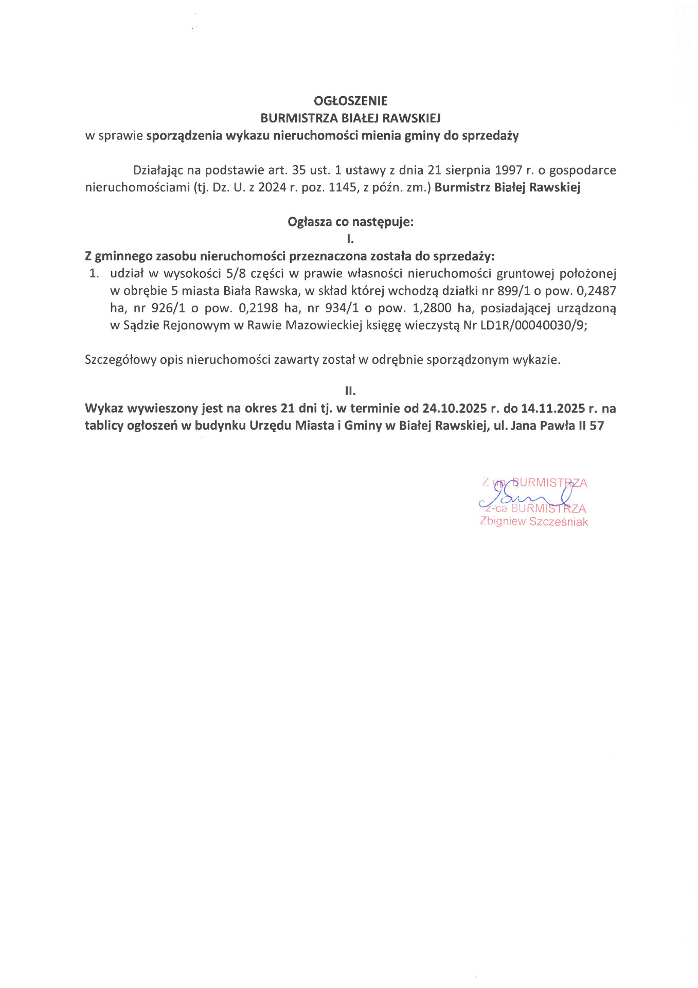Ogłoszenie Burmistrza Białej Rawskiej w sprawie sporządzenia wykazu nieruchomości przeznaczonych do sprzedaży