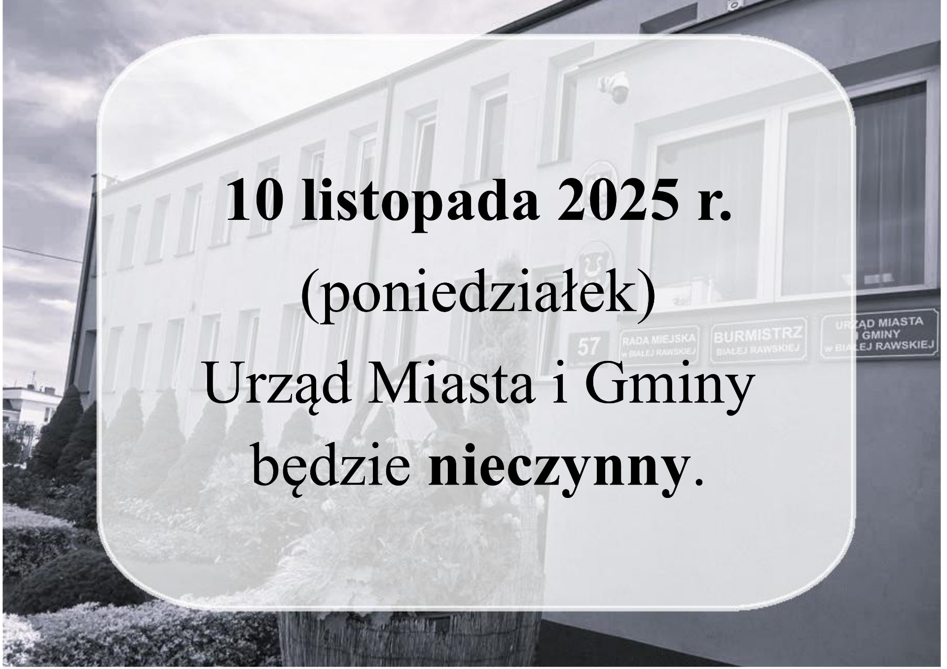 Zarządzeniem nr 134/2025 Burmistrza Białej Rawskiej z dnia 17 października 2025 roku w sprawie ustalenia dnia wolnego od pracy w zamian za święto przypadające w sobotę 1 listopada 2025 r., dzień ten został wyznaczony na 10 listopada br.