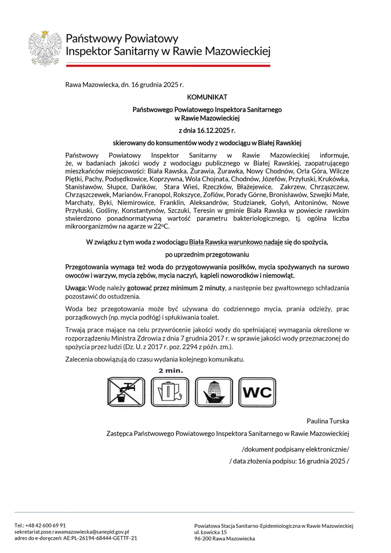 KOMUNIKAT Państwowego Powiatowego Inspektora Sanitarnego w Rawie Mazowieckiej z dnia 16.12.2025 r. skierowany do konsumentów wody z wodociągu w Białej Rawskiej