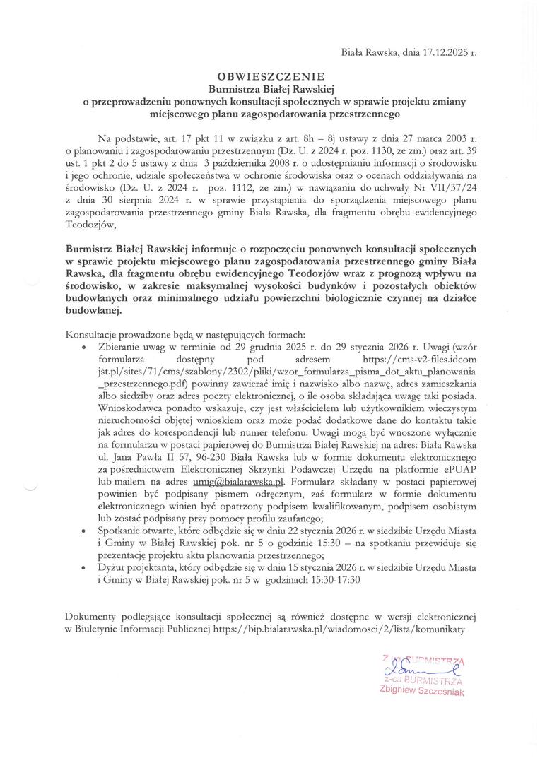 Obwieszczenie Burmistrza Białej Rawskiej o przeprowadzeniu ponownych konsultacji społecznych w sprawie projektu zmiany miejscowego planu zagospodarowania przestrzennego