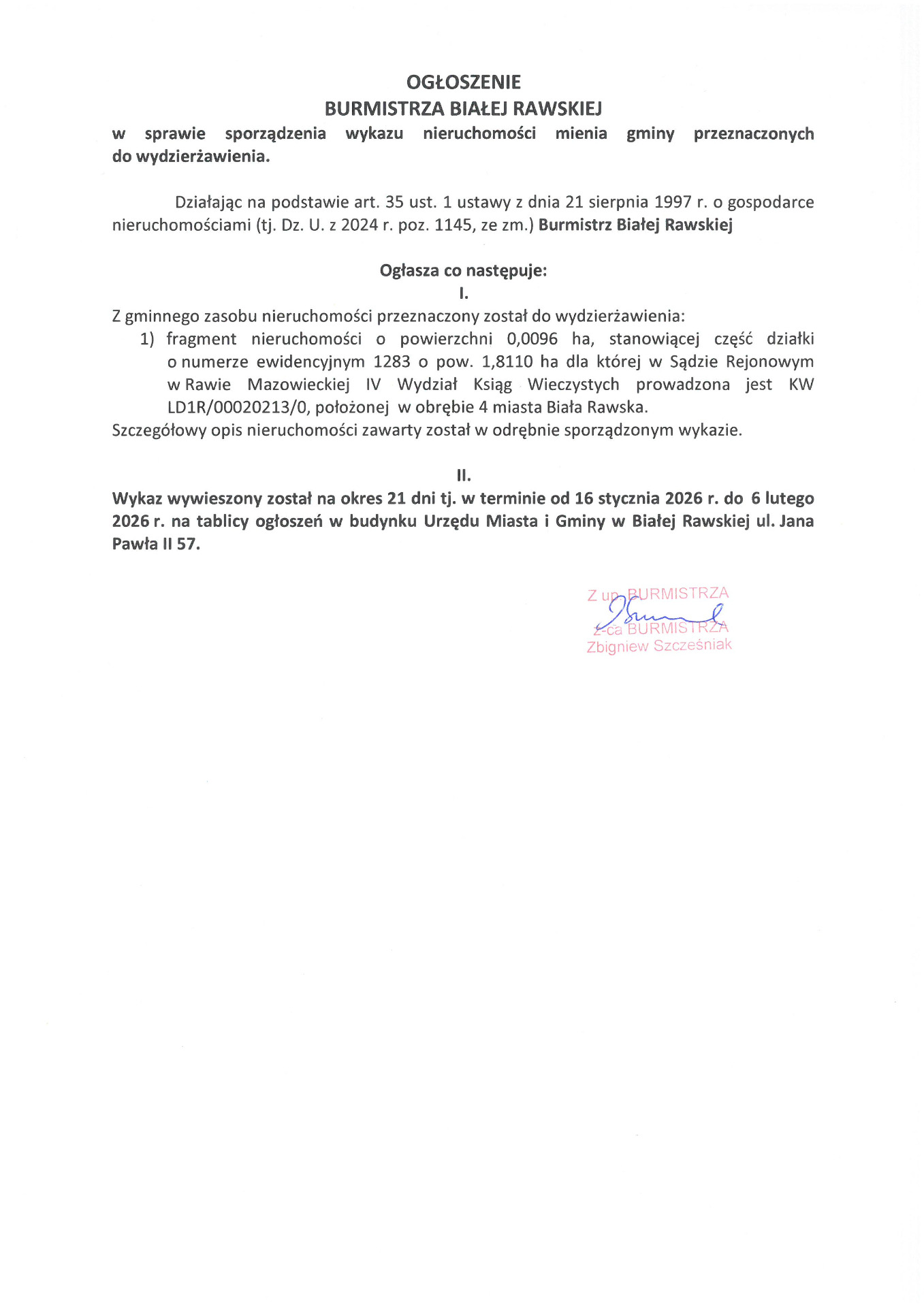 Ogłoszenie Burmistrza Białej Rawskiej w sprawie sporządzenia wykazu nieruchomości przeznaczonych do wydzierżawienia