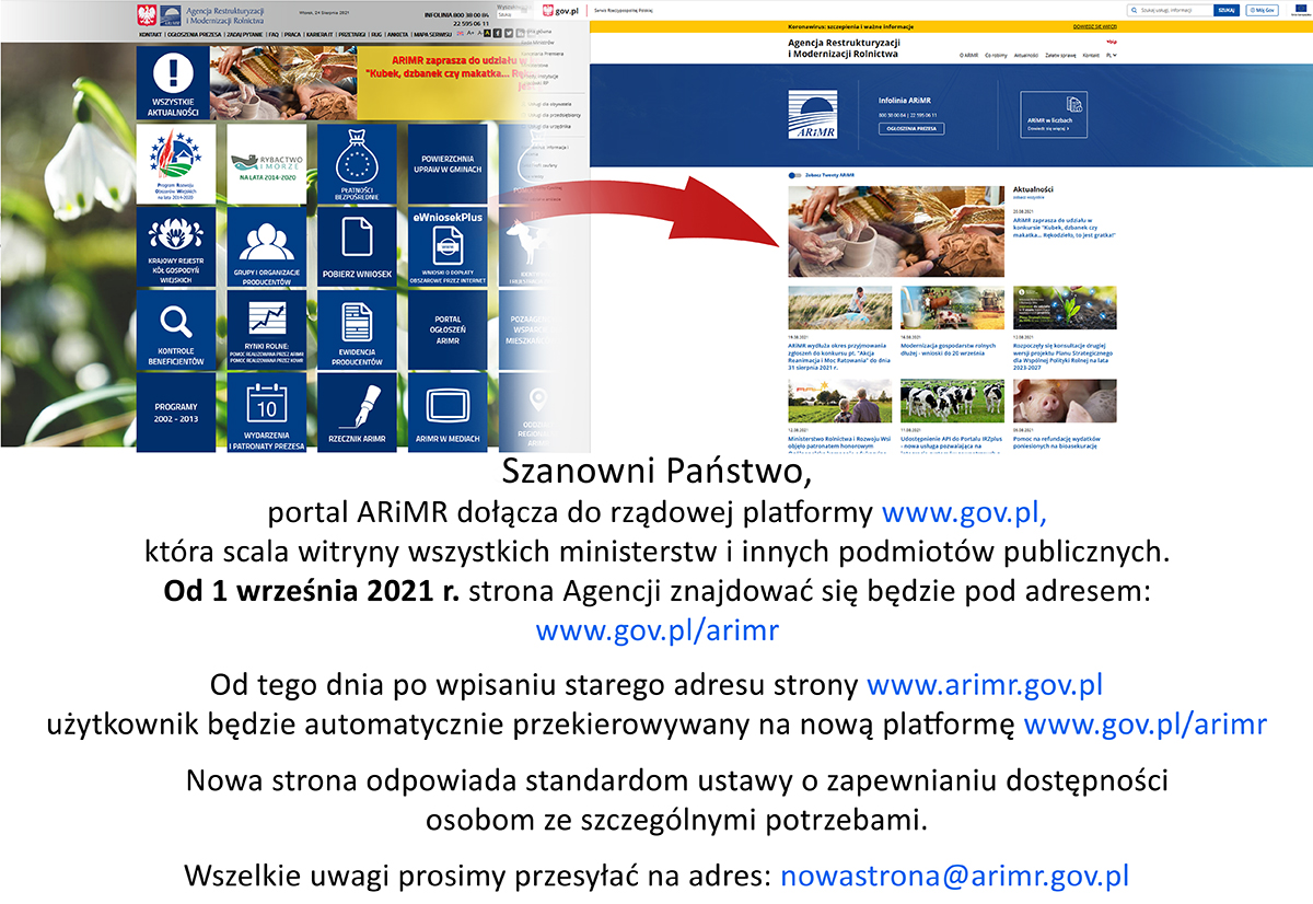Z początkiem września strona Agencji Restrukturyzacji i Modernizacji Rolnictwa znajdować się będzie pod adresem: www.gov.pl/arimr. Po wpisaniu starego adresu strony: www.arimr.gov.pl użytkownicy będą automatycznie przekierowywani na nową platformę: www.gov.pl/arimr.