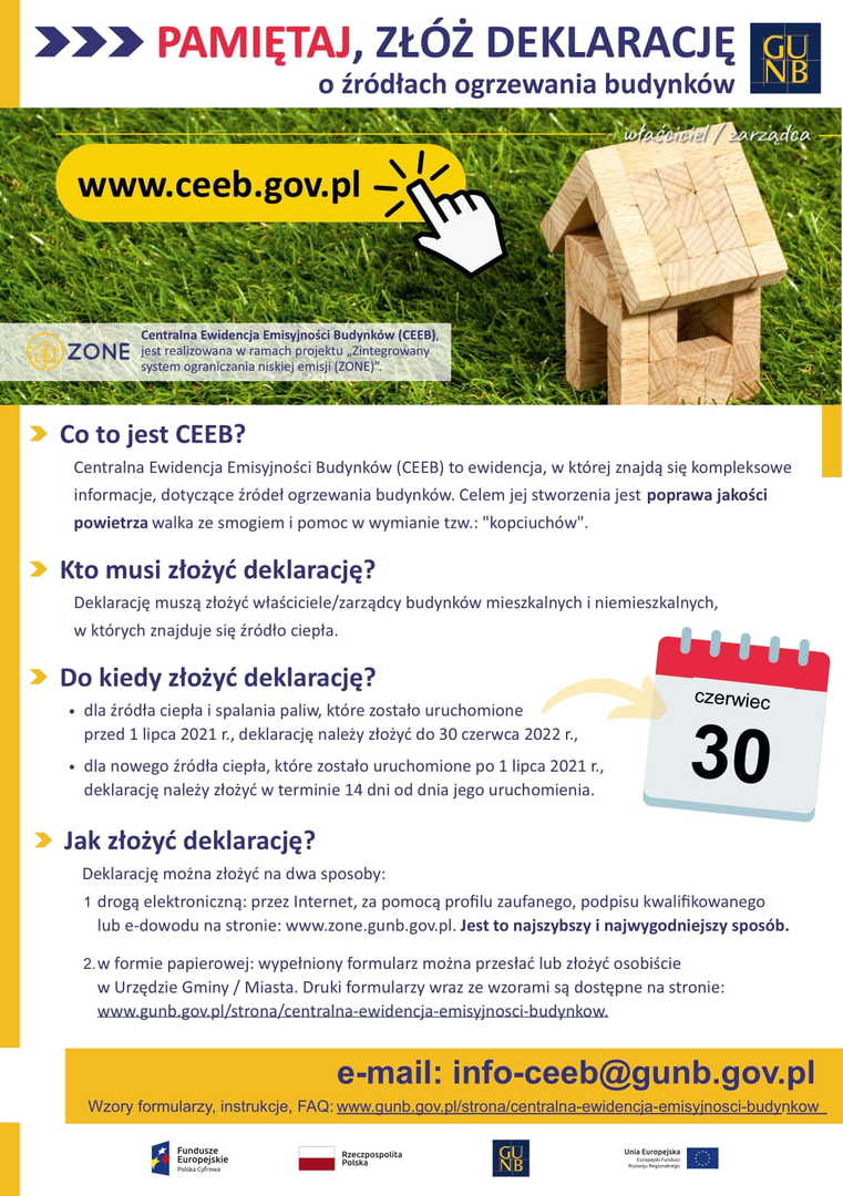 Przypominamy, że do 30 czerwca 2022 roku każdy Właściciel lub Zarządca nieruchomości ma obowiązek złożenia deklaracji do Centralnej Ewidencji Emisyjności Budynków (CEEB) dotyczącej źródeł ciepła i spalania paliw.