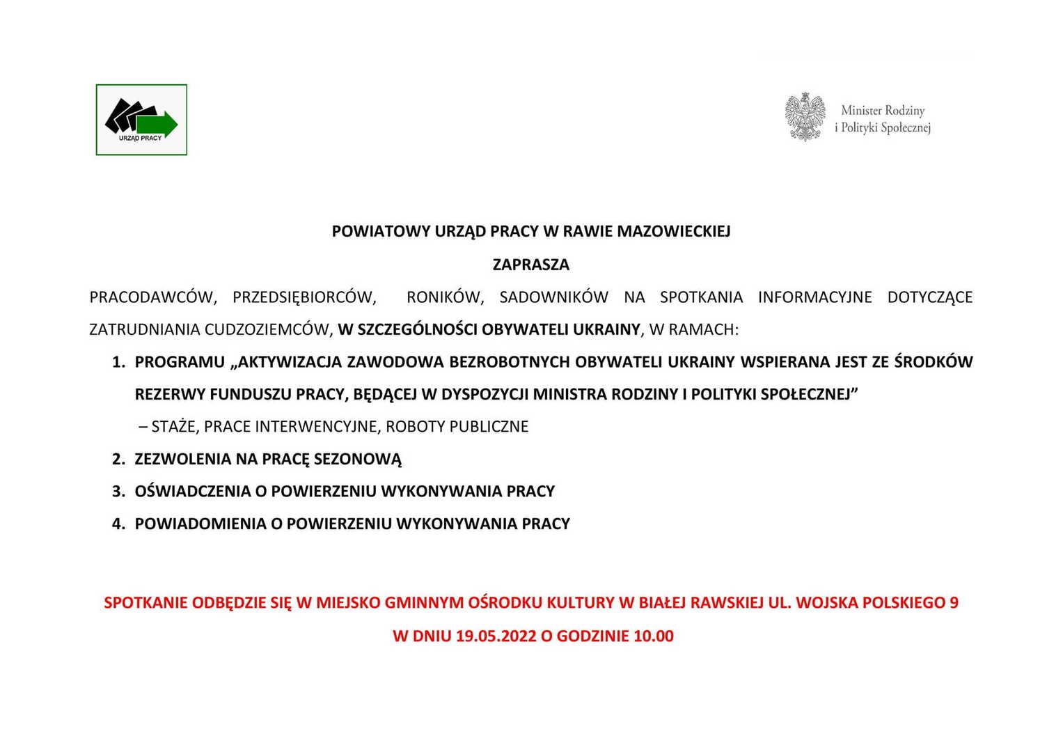 POWIATOWY URZĄD PRACY W RAWIE MAZOWIECKIEJ ZAPRASZA PRACODAWCÓW, PRZEDSIĘBIORCÓW, RONIKÓW, SADOWNIKÓW NA SPOTKANIE INFORMACYJNE DOTYCZĄCE ZATRUDNIANIA CUDZOZIEMCÓW, W SZCZEGÓLNOŚCI OBYWATELI UKRAINY W DNIU 19.05.2022R. G. 10:00