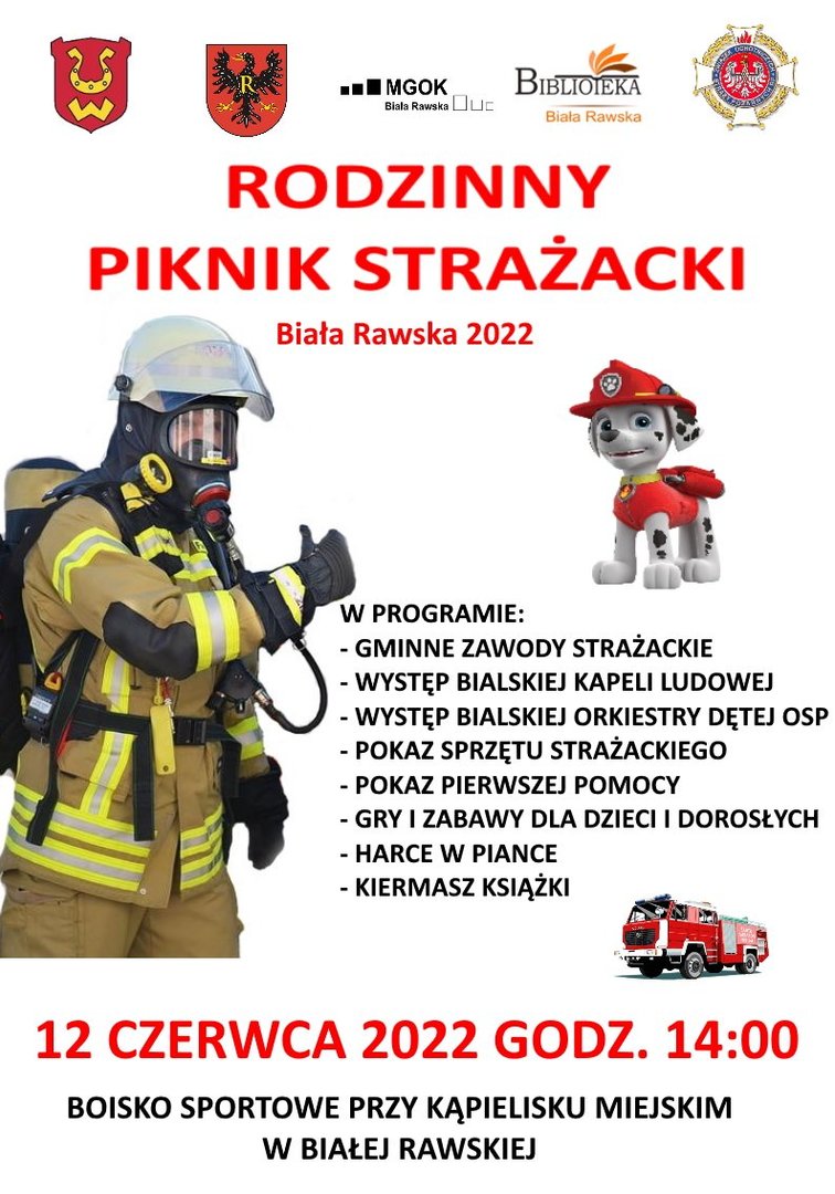 Rodzinny Piknik Strażacki Biała Rawska. Zapraszamy 12 czerwca 2022 godzina 14:00. Boisko sportowe przy Kąpielisku Miejskim w Białej Rawskiej
