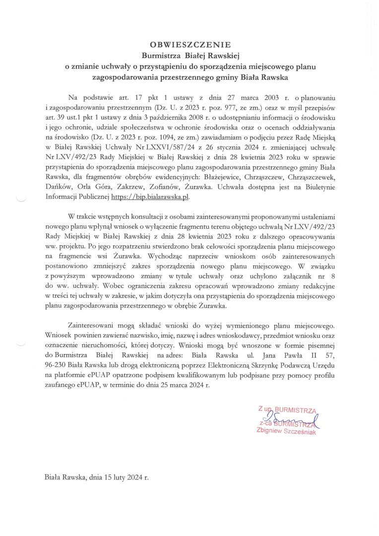 Obwieszczenie Burmistrza Białej Rawskiej o zmianie uchwały o przystąpieniu do sporządzenia miejscowego planu zagospodarowania przestrzennego gminy Biała Rawska