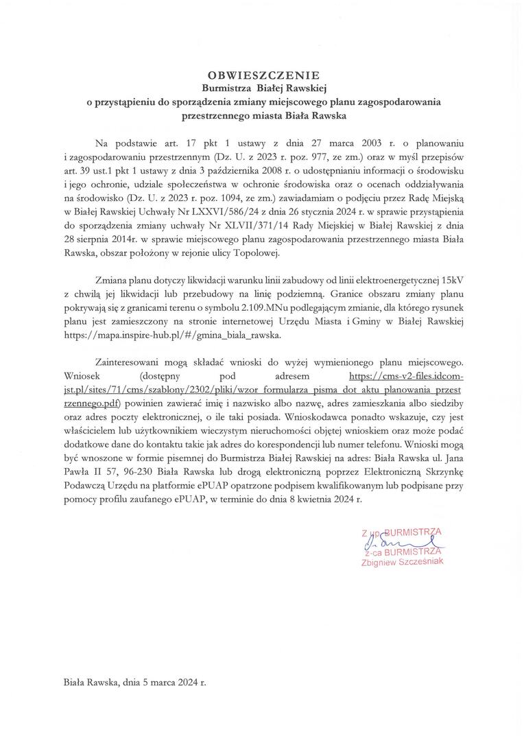 Obwieszczenie Burmistrza Białej Rawskiej o zmianie uchwały o przystąpieniu do sporządzenia miejscowego planu zagospodarowania przestrzennego gminy Biała Rawska