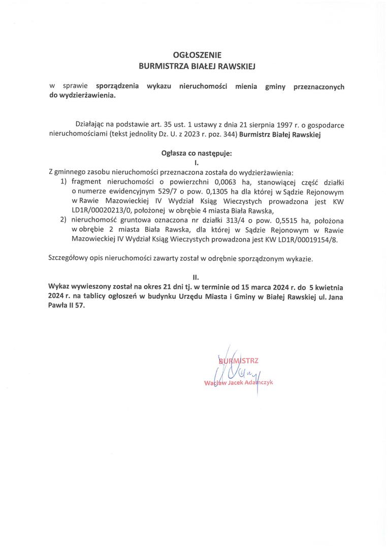 Ogłoszenie Burmistrza Białej Rawskiej w sprawie sporządzenia wykazu nieruchomości mienia gminy przeznaczonych do sprzedaży